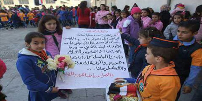 نفذ فرع منظمة طلائع البعث في حماة اليوم نشاط دعم نفسي واجتماعي لأطفال مدرسة السعن بمنطقة سلمية تضمن تقديم عروض فنية وترفيهية وتنفيذ مشغولات يدوية وتشكيل مجسمات من توالف البيئة فضلا عن رسم العلم الوطني على لوحة كبيرة من الكرتون.