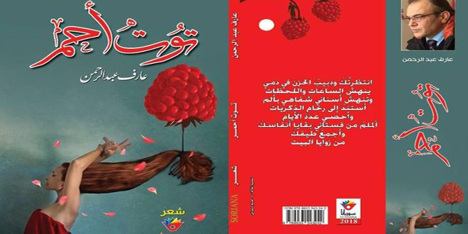 توت أحمر من منشورات مؤسسة سوريانا للإنتاج الإعلامي وتقع في 150 صفحة من القطع المتوسط وسبق للشاعر عارف عبد الرحمن أن صدرت له مجموعتان هما “قصائد الحب والسلام” و”رسائل الحمام الزاجل”.