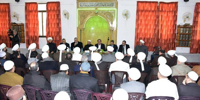 وبين محافظ حلب حسين دياب أهمية دور رجال الدين في التنوير وبناء الأجيال ونشر القيم والتعاليم الصحيحة للدين الاسلامي السمح في ظل التشويه الكبير والمتعمد من قبل التنظيمات الارهابية والتكفيرية الوهابية التي حاولت استخدام الدين كوسيلة وقناع لتحقيق مخططاتها المدعومة من الدول الاستعمارية والرجعية بهدف النيل من الوطن.