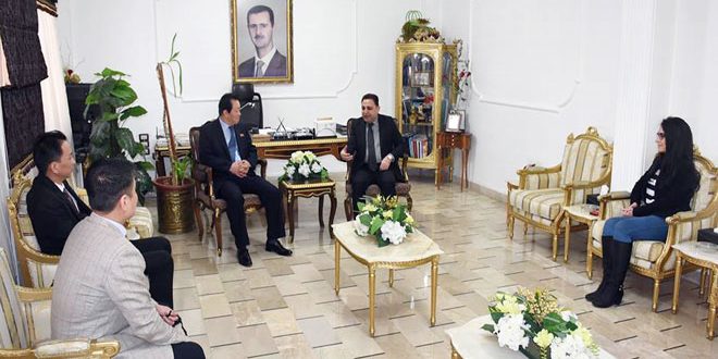 بحث رئيس اتحاد شبيبة الثورة معن عبود خلال لقائه اليوم سفير جمهورية كوريا الديمقراطية الشعبية بدمشق زانغ ميونغ هو سبل تعزيز التعاون الشبابي بين البلدين الصديقين وتبادل الوفود الشبابية وإقامة الفعاليات والملتقيات المشتركة.