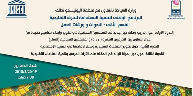 تستعد وزارة السياحة لإطلاق المرحلة الثانية من البرنامج الوطني للتنمية المستدامة بالتعاون مع اللجنة الوطنية السورية لليونيسكو وذلك يومي الاثنين والثلاثاء من شباط الجاري في فندق الداما روز بدمشق.