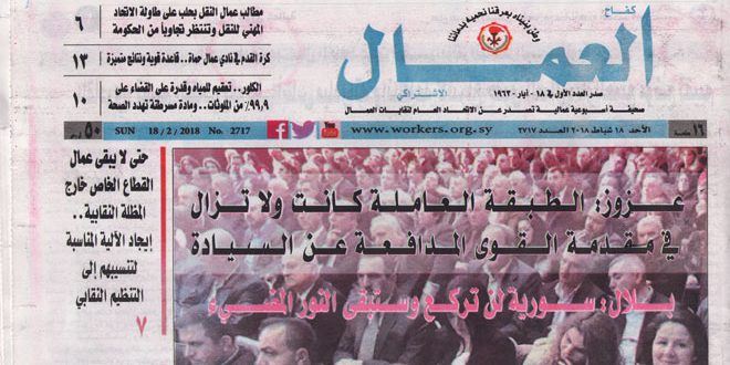 تضمن العدد الجديد من جريدة كفاح العمال الاشتراكي الصادرة عن الاتحاد العام لنقابات العمال أخباراً عن نشاطات نقابات العمال في دمشق والمحافظات ومؤتمراتها السنوية فضلا عن مقالات ودراسات منوعة في الفكر والأدب.