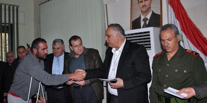 كرمت مديرية زراعة حمص اليوم عددا من الجرحى وذوي شهداء الجيش العربي السوري والمزارعين الفائزين في المباريات الإنتاجية وذلك على هامش الندوة التي أقامتها حول آفاق تطوير العمل الزراعي وتعزيز التواصل مع المزارعين تخللها مسابقة علمية .