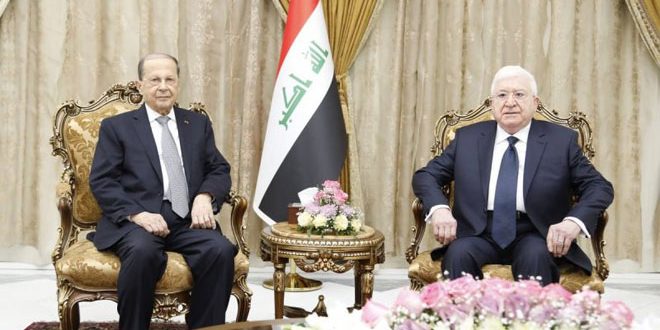 وقال عون خلال لقائه معصوم في قصر السلام بالعاصمة العراقية بغداد اليوم “إن الازمات التي مر بها العراق حالت دون تعزيز التعاون مع لبنان ودفعه قدما ولكن مرحلة التعافي التي يعيشها العراق ستعيد العلاقات اللبنانية العراقية إلى افضل مستوياتها” مشددا على أن لبنان يقف بقوة مع وحدة العراق وضد كل المشاريع والنزعات التي تهدف إلى تهديد وحدة كيانه.