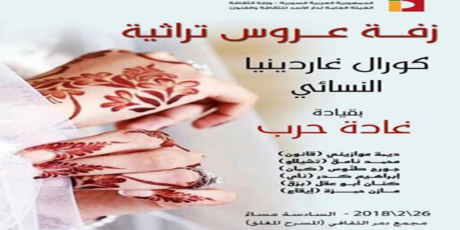 يقدم كورال غاردينيا النسائي بقيادة المايسترو غادة حرب حفلاً غنائياً بعنوان “زفة عروس تراثية” عند السادسة من مساء يوم الاثنين القادم على خشبة المسرح المغلق في مجمع دمر الثقافي.