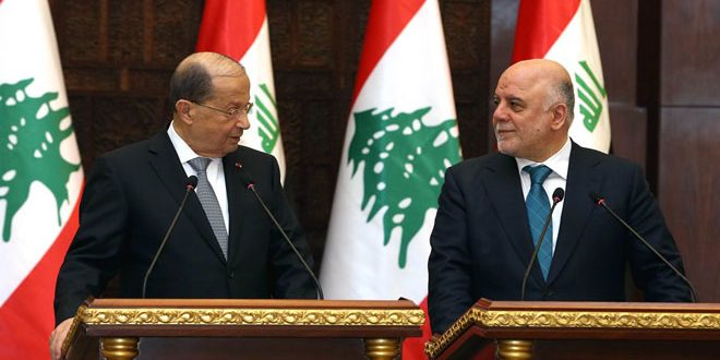 بحث الرئيس اللبناني ميشال عون ورئيس الوزراء العراقي حيدر العبادي خلال لقائهما في بغداد اليوم التعاون الثنائي بين البلدين في مختلف المجالات وبينها مكافحة الإرهاب وإبعاد خطره عن المنطقة والعالم إضافة إلى تهديدات العدو الإسرائيلي للبنان وأطماعه البحرية والبرية.