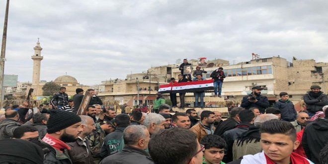 وأفاد مراسل سانا في حلب بأن الأهالي أكدوا خلال تجمعهم في الساحة الرئيسية وسط المدينة انتماءهم لوطنهم سورية مرحبين بانخراط القوات الشعبية في مواجهة عدوان النظام التركي المتواصل على منطقة عفرين.