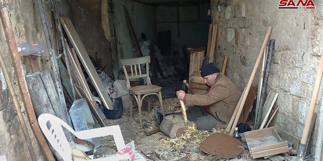 يطل النجار أبو بكري محمد جانات من باب الحديد أقدم منطقة أثرية بحلب ويتجه صباحا الى محله الذي تهدم جراء الحرب الارهابية التي رزحت تحتها المدينة القديمة واتت على معالمها ليقف أمامه بحسرة لأنه أمضى عمره في هذا المكان لأكثر من 40 عاما والذي تعلم فيه حرفة النجارة العربية مهنة الآباء والأجداد.