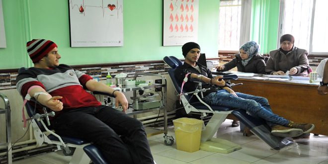 دعما لجرحى الجيش والقوات المسلحة نفذ فرع دمشق للاتحاد الوطني لطلبة سورية اليوم حملة تبرع بالدم بمشاركة أكثر من 150 شابا في مركز نقل الدم في جامعة دمشق.