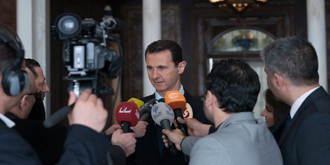 وقال الرئيس الأسد في تصريح صحفي لعدد من وسائل الإعلام عقب لقائه اليوم حسين جابري أنصاري كبير مساعدي وزير الخارجية الإيراني للشؤون السياسية الخاصة والوفد المرافق له “إن موضوع الحالة الإنسانية التي يتحدث بها الغرب هو كذبة سخيفة جدا فالتحالف الغربي يقوم بارتكاب المجازر بشكل مستمر ضد المدنيين في سورية وهذا الغرب يدافع عن “جبهة النصرة” و”داعش” والمنظمات الإرهابية تحت عناوين لم تعد مقنعة حتى للرأي العام الغربي”.