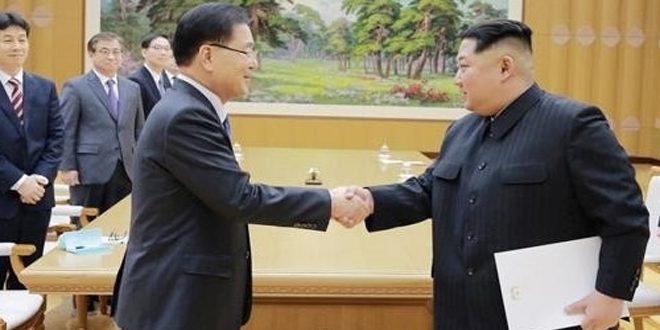 بحث رئيس كوريا الديمقراطية كيم جونغ أون مع أعضاء الوفد الكوري الجنوبي برئاسة المبعوث الخاص لرئيس كوريا الجنوبية تشونغ اوي يونغ سبل تخفيف التوتر في شبه الجزيرة الكورية وتحقيق المزيد من عودة الدفء للعلاقة بين الجانبين.