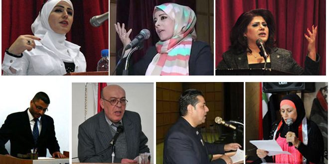 وألقت الشاعرة نبوغ أسعد قصيدة بعنوان /العرض الأعز/ رأت فيها أن الوطن هو كينونة الإنسان وأخلاقه وشرفه وأن سورية هي أسمى ما يكون في العالم مهما جاءت به الادعاءات الباطلة ضدها فقالت..