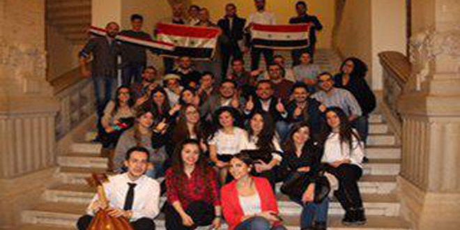 وعرض الطلبة مجموعة من الصور التي تظهر عراقة وحضارة وطنهم الأم سورية كما قدموا شرحا للأوضاع التي يعيشها في ظل الهجمة الإرهابية ومحاولات التضليل الإعلامي التي تمارسها بعض وسائل الإعلام الغربية والعربية لتشويه انتصارات الجيش السوري ضد الإرهاب الدولي.