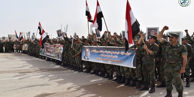 وفي ختام كلماتهم عاهد القادة شعبنا والسيد الرئيس بشار الأسد على أن تواصل قواتنا المسلحة مهامها الوطنية في ملاحقة العصابات الإرهابية المسلحة حتى القضاء عليها وإعادة الأمن والاستقرار إلى ربوع الوطن.