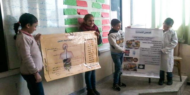 بمعلومات وإرشادات صحية بسيطة تناسب الأطفال ينتقل مشروع المنهج الصحي من مدرسة إلى أخرى في محافظة حمص لتوعية الصغار بمواضيع متنوعة كالوقاية من الأمراض والإسعافات الأولية والعناية بالمسنين ومخاطر التدخين وبما يساعد تدريجيا على تبني المجتمع لعادات صحية سليمة.