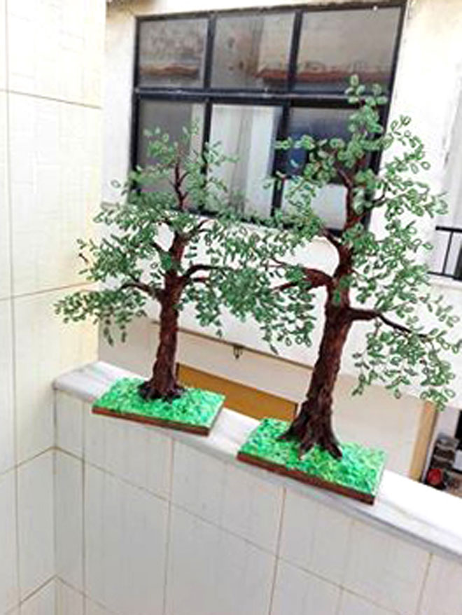 سلوى عبد الله من سكان قرية جنين بمشتى الحلو في طرطوس بينت أنها استوحت من طبيعة جنين مواضيعها وأفكارها، لافتة إلى أنها أنجزت بعض أعمالها باستخدام مخلفات بسيطة مثل قشر البصل والثوم وأطباق كرتون البيض والصدف والقش وأنواع مختلفة من الحجارة.