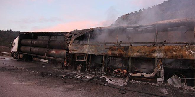 ونقلت وكالة الأناضول عن السلطات التركية قولها إن “حافلة ركاب اصطدمت صباح اليوم بشاحنة متوقفة على جانب الطريق السريع في محافظة كوروم ما تسبب باشتعال النيران في الحافلة ومصرع 13 شخصا وإصابة آخرين.