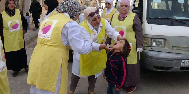 زينة مقداد مسؤولة فرق التلقيح بمنطقة درعا الصحية أوضحت ان الفرق الجوالة والثابتة والتي تضم21 عنصرا لاقت تجاوبا واضحا من المواطنين وغطت احياء مدينة درعا وتمكنت من الوصول إلى 4000 طفل ولم تتوقف عن عملها رغم الظروف الصعبة والاعتداءات بالقذائف.