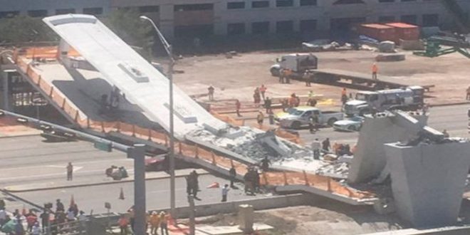 أعلن بيل نيلسون عضو مجلس الشيوخ الأمريكي عن ولاية فلوريدا مقتل ما بين ستة وعشرة أشخاص جراء انهيار جسر شيد حديثا للمشاة على عدة حارات مرورية عند جامعة فلوريدا الدولية.