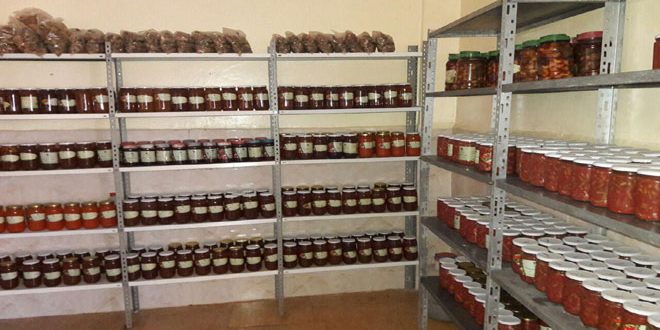 وخلال العام الماضي تم إنتاج كميات متنوعة من المواد الغذائية وطرحها للبيع في السوق المحلية وفقاً لمدير المشروع محمد الحسن الذي ذكر أن هذه الكميات شملت 200 تنكة جبنة و13 طناً من مادة المحمرة و9 أطنان ملوخية و8 أطنان زيتون و13 طناً دبس بندورة وطنين من المخللات وعدة أنواع من المربيات حسب المواسم الزراعية ودبس الرمان إلى جانب وجود قسم للطبخ وإنتاج مواد المونة حسب طلب العائلات.