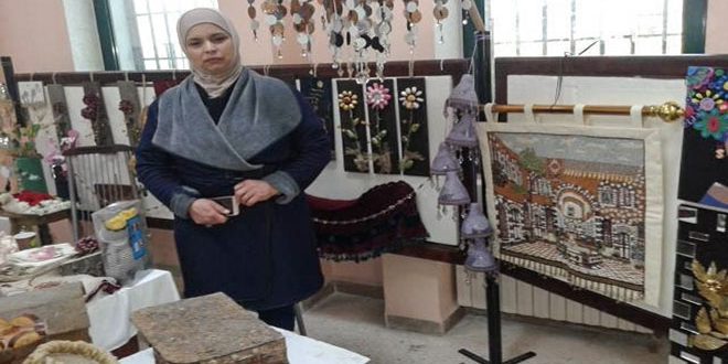 ولفتت أعمال الفنان رؤوف حنا بيطار المشارك بلوحات وأوان زجاجية منوعة مدمجة مع الخشب الزوار كونها تروي التاريخ الحضاري لسورية، فيما عبقت منتجات الفنانة التطبيقية ميساء كلش برائحة التراث كالبيت الدمشقي القديم الذي صنعته من الخرز والاعمال اليدوية التي اعتمدت فيها على إعادة التدوير لكل ما هو موجود من أقمشة ومواد طبيعية لإعادة إنتاجها بحلة جديدة لافتة إلى أنها أسست مشروعها الصغير للأعمال اليدوية اعتمادا على موهبتها الفنية ومستفيدة من دراستها في معهد الفنون التشكيلية والتطبيقية.