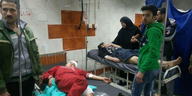 وفي دمشق ذكر مصدر في قيادة شرطة دمشق أن قذيفة صاروخية أطلقها إرهابيون متحصنون في ما تبقى من مناطق في الغوطة الشرقية سقطت قرب صالة الجلاء الرياضية في منطقة المزة ما تسبب بإصابة امرأة و5 أطفال بجروح ووقوع أضرار مادية بعدد من السيارات المركونة في المكان.