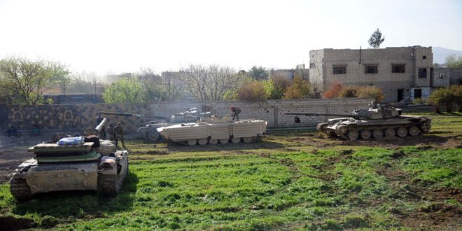 وذكر موفد سانا إلى الغوطة الشرقية إن وحدات الجيش العاملة على محور عين ترما في القطاع الجنوبي من الغوطة نفذت عمليات جديدة داخل المزارع سيطرت خلالها على نحو 70 بالمئة من المزارع المحيطة ببلدة عين ترما بعد دحر التنظيمات الإرهابية منها.