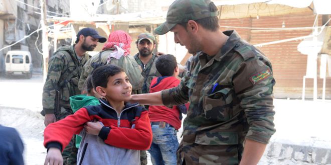 2018-03-21دمشق-سانايواصل الجيش العربي السوري بالتعاون مع الهلال الأحمر تأمين الأهالي داخل منازلهم وإيصال المساعدات المختلفة لهم في كفر بطنا وسقبا بالغوطة الشرقية. الجيش يواصل تأمين المدنيين داخل منازلهم في سقبا وكفر بطنا بالغوطة 2018-03-21mohamad