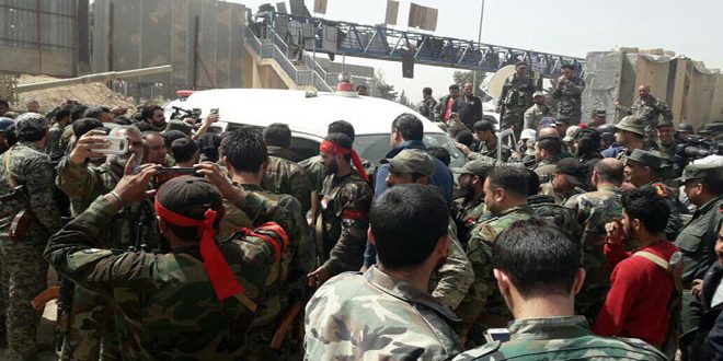 حرر الجيش العربي السوري صباح اليوم عددا من المختطفين المحتجزين داخل مدينة حرستا على أطراف الغوطة الشرقية بريف دمشق في حين غادرت 30 حافلة تقل 413 إرهابيا وعائلاتهم نحو إدلب بعد إخراجهم من مدينة حرستا تمهيدا لعودة جميع مؤسسات الدولة إليها.