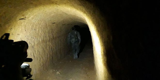 عثرت وحدات من الجيش العربي السوري على شبكة أنفاق خلال تمشيطها الأحياء المحررة من مخلفات التنظيمات الإرهابية في بلدة عين ترما بالغوطة الشرقية بالتوازي مع تأمين الأهالي داخل منازلهم في البلدة.