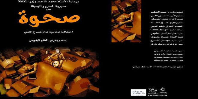 احتفالا بيوم المسرح العالمي تقدم مديرية المسارح والموسيقا عند الساعة السادسة من مساء الثلاثاء القادم مسرحية بعنوان (صحوة) إعداد وإخراج كفاح الخوص على خشبة مسرح الحمراء بدمشق.