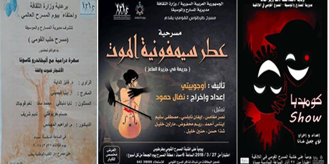 تطلق مديرية المسارح والموسيقا في وزارة الثقافة بعد غد خمسة عروض مسرحية في كل من اللاذقية وطرطوس والسويداء وحلب والحسكة احتفاء بيوم المسرح العالمي.