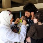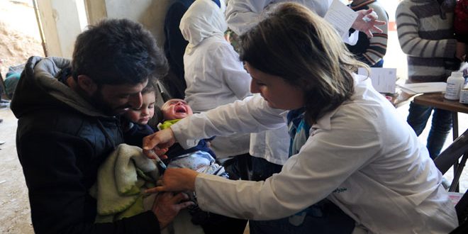 وأرسلت وزارة الصحة منذ إعلان تحرير بلدات الغوطة وتطهيرها من الإرهاب بفضل بطولات الجيش العربي السوري كوادر متخصصة وعيادات متنقلة تقدم كل الخدمات الصحية للأهالي إضافة إلى تأمين اللقاحات اللازمة لأطفالها بعد حرمانهم منها لسنوات بسبب سطوة التنظيمات الإرهابية على بلدات الغوطة الشرقية.