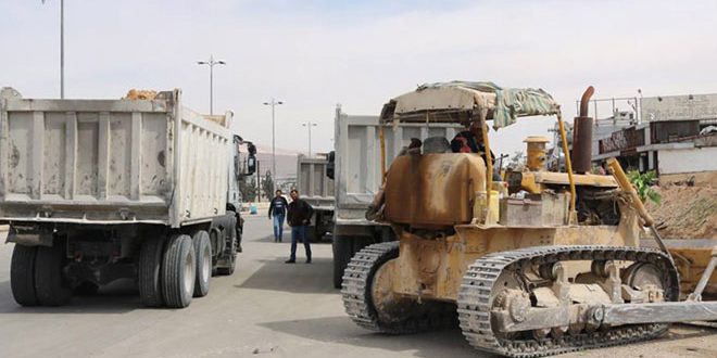 وأعلن الجاسم بدء العمل على محور عربين زملكا عين ترما وحاجز سقبا لترحيل الأنقاض وفتح الطرقات مؤءكدا أنه تم فتح قسم من الطرقات التخديمية في الجهة التي فيها الأهالي لتسهيل عملية الحركة والتنقل فيما باشرت الآليات في ترحيل الأنقاض المتراكمة على أوتوستراد دمشق حمص من جهة حرستا.