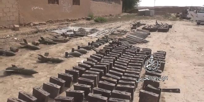 وكانت وحدات الجيش عثرت أمس في قرى الصالحية والدوير والكشمة وسبيخان جنوب شرق مدينة الميادين بريف دير الزور على اتجاه البوكمال على مستودعات تحتوي كميات من الأسلحة والذخائر والمواد الكيماوية والمتفجرة والأحزمة الناسفة من مخلفات تنظيم “داعش” من بينها ذخائر وقذائف منشؤها كيان العدو الإسرائيلي وحشوات مدفع عيار 155 صناعة حلف الناتو.