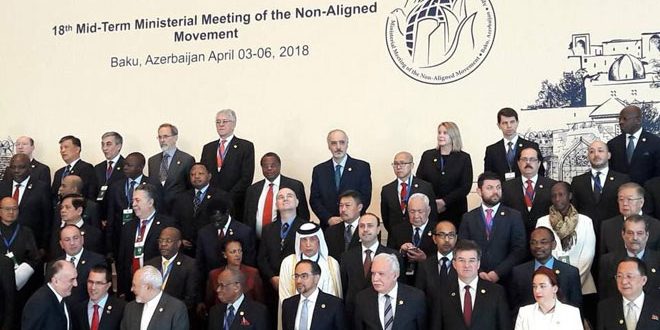 انطلقت في العاصمة الاذربيجانية باكو اليوم اعمال الاجتماع الثامن عشر لوزراء خارجية بلدان حركة عدم الانحياز وذلك بمشاركة وفد الجمهورية العربية السورية برئاسة الدكتور بشار الجعفري المندوب الدائم للجمهورية العربية السورية لدى الامم المتحدة في نيويورك.