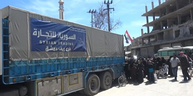 وخلال قيام سيارة تابعة للمؤسسة السورية للتجارة أوضح المهندس يوسف العقلة معاون مدير فرع ريف دمشق أنه يتم بيع المواد الغذائية والسلع المتنوعة للأهالي عبر 4 سيارات جوالة يوميا إضافة إلى سيارات تبيع اسطوانات الغاز المنزلي وأخرى تبيع المنظفات لافتا إلى أنه يتم العمل على تأهيل صالة المؤسسة لافتتاحها في الأيام القليلة القادمة.