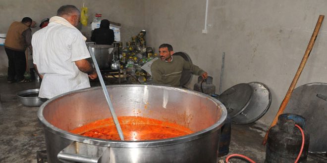 2018-04-07 سيدات ورجال من أهالي الغوطة يتشاركون بإعداد الطعام في مركز الإقامة المؤقتة بالحرجلة 2018-04-07mohamad