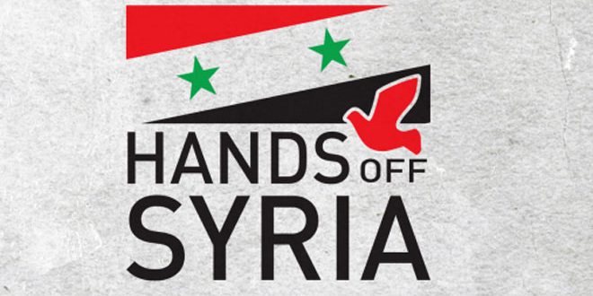 دعت مجموعة “إرفعوا أيديكم عن سورية” البريطانية اليوم المواطنين البريطانيين إلى الخروج في مظاهرة شعبية وسط لندن وأمام مقر إقامة رئيسة الوزراء تيريزا ماي في “داوننغ ستريت” للتعبير عن الرفض الشعبي لمشاركة بريطانيا في أي عدوان عسكري قد يشن ضد سورية.