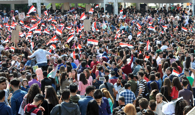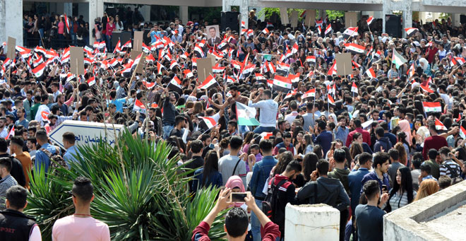 وعبر الطلاب والعاملون عن تنديدهم بالعدوان السافر الذي شنته الولايات المتحدة وفرنسا مشيرين إلى فخرهم بما قامت به الدفاعات الجوية السورية في صد العدوان الأمر الذي يشكل مصدر عز وكرامة لكل سوري.