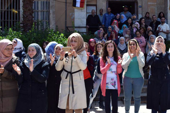 ورفع الطلاب في وقفتهم الأعلام السورية واللافتات المنددة بهذا العمل الجبان مرددين الهتافات التى تحيي بطولات جيشنا العربي السوري وتؤكد ثقتهم الكبيرة بأبطاله الذين استبسلوا فى صد العدوان عن أرض سورية التي ستبقى عرين المقاومة وقلب العروبة النابض مؤكدين أن هذا العمل يأتي لرفع معنويات التنظيمات الارهابية المسلحة التى خرجت من الغوطة الشرقية مدحورة تحت ضربات أبطال الجيش العربي السوري.