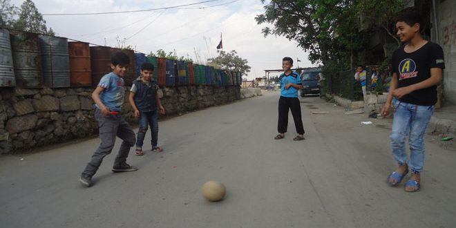 في الشارع المؤدي إلى مركز المخيم يتحين اطفال الفترة الفاصلة بين مرور سيارة وأخرى.. ليلهوا بكرة بيضاء قديمة يقول مرشد طفل في الثانية عشرة “ثلاثة من زملائي استشهدوا وآخرون جرحى جراء قذيفة سقطت على منزلنا.. الآن اشعر بالأمان .. لا قذائف”.. مستجيبا لنداء زميله ليعاود اللعب بمرح.. فالإرهاب زال.