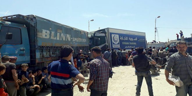 في إطار الإجراءات الحكومية لدعم الأهالي في مدينة دوما بالغوطة الشرقية أدخلت المؤسسة السورية للتجارة اليوم عددا من الشاحنات المحملة بالمواد الغذائية ومادة الخبز ووزعتها على الأهالي مجانا.