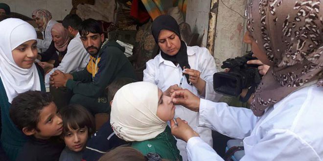 في إطار الجهود التي تبذلها الجهات الحكومية لإعادة الحياة الطبيعية إلى مدينة دوما في الغوطة الشرقية بعد تطهيرها من الإرهاب قدمت فرقة طبية من وزارة الصحة لقاحات للأطفال بعد حرمانهم منها نتيجة سطوة إرهابيي “جيش الإسلام” الذين صادروا الأدوية واللقاحات والمواد الغذائية واتخذوا المدنيين دروعا بشرية.