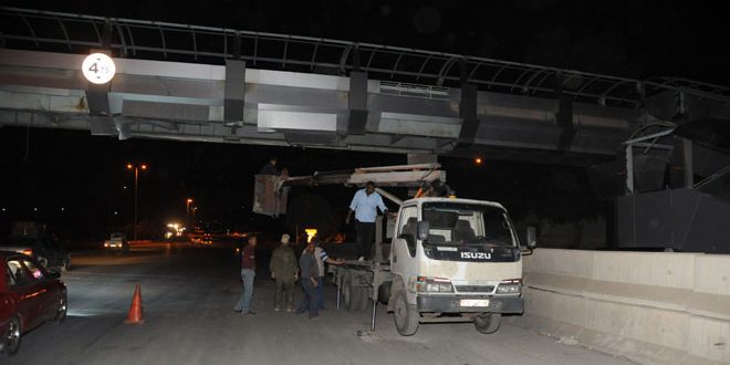 انهار أحد طرفي جسر للمشاة على طريق أوتستراد المزة بدمشق دون وقوع إصابات أو أضرار جراء اصطدام حفارة محملة على ناقلة بجسم الجسر.