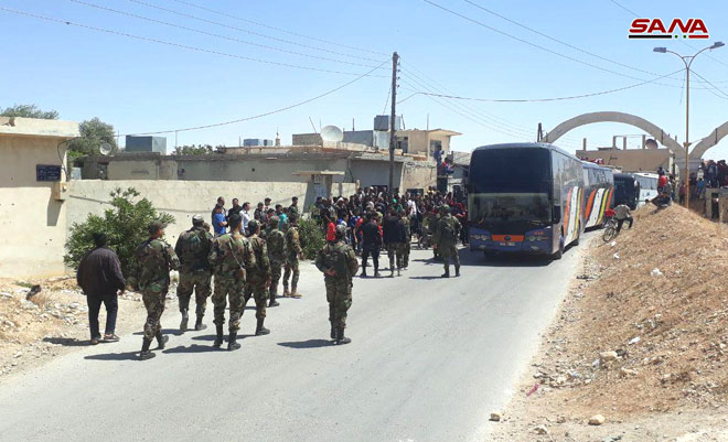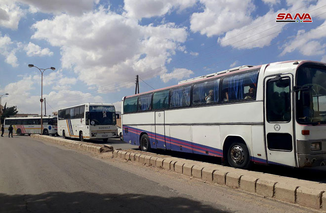 وذكر مراسل سانا الحربي من ريف دمشق أن 35 حافلة تقل المئات من الإرهابيين وعائلاتهم من الرحيبة وجيرود والناصرية انطلقت على شكل قافلة من نقطة تجمعها على أطراف بلدة الرحيبة إلى الشمال السوري.