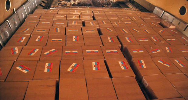 وصلت اليوم طائرة روسية محملة بـ 17 طنا من المساعدات الغذائية تتضمن أغذية الأطفال والسكر والمعلبات ومساعدات إنسانية أخرى إلى مطار الشهيد باسل الأسد في اللاذقية مقدمة من الحكومة والشعب الروسيين والجمعية الامبراطورية الروسية الأرثوذكسية الفلسطينية والجمعية السورية الروسية روسيا سار إلى الشعب السوري.
