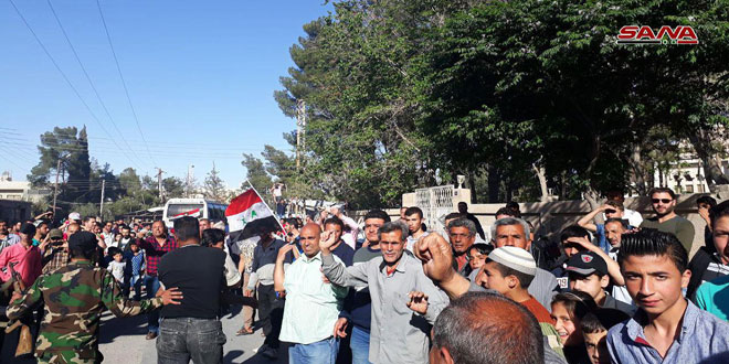 وأشار المراسل إلى أن المئات من أهالي البلدة نظموا مسيرة جابت شوارع البلدة ابتهاجا بعودة الأمن والأمان حاملين الاعلام الوطنية وصور السيد الرئيس بشار الأسد مرددين هتافات تمجد بطولات الجيش العربي السوري وانتصاراته على الإرهاب وصولاً إلى ساحة البلدة حيث رفع العلم الوطنى على سارية فى حين أدى عناصر وضباط قوى الامن الداخلى التحية العسكرية.