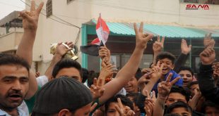 وبين المراسل أن وحدات الشرطة دخلت مبنى الناحية ورفعت العلم الوطني وسط هتافات الأهالي المحتشدين بفداء الوطن والتضحية في سبيل عزته ومنعته والدعوة إلى الالتحاق بصفوف الجيش العربي السوري حتى دحر التنظيمات الإرهابية من أرض الوطن.