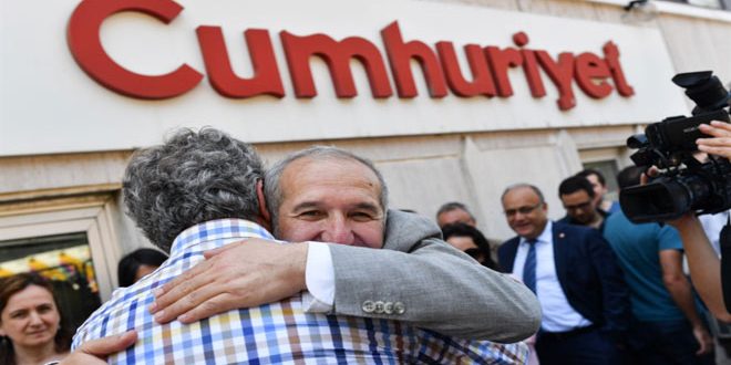 وكان آتلي وصل صباح اليوم إلى مقر صحيفة جمهورييت حيث نشرت على المقر لافتة عملاقة تضمنت صورته وعبارة “لست وحدك” وقال لزملائه الذين استقبلوه بالتصفيق “لن نستكين للخوف”.